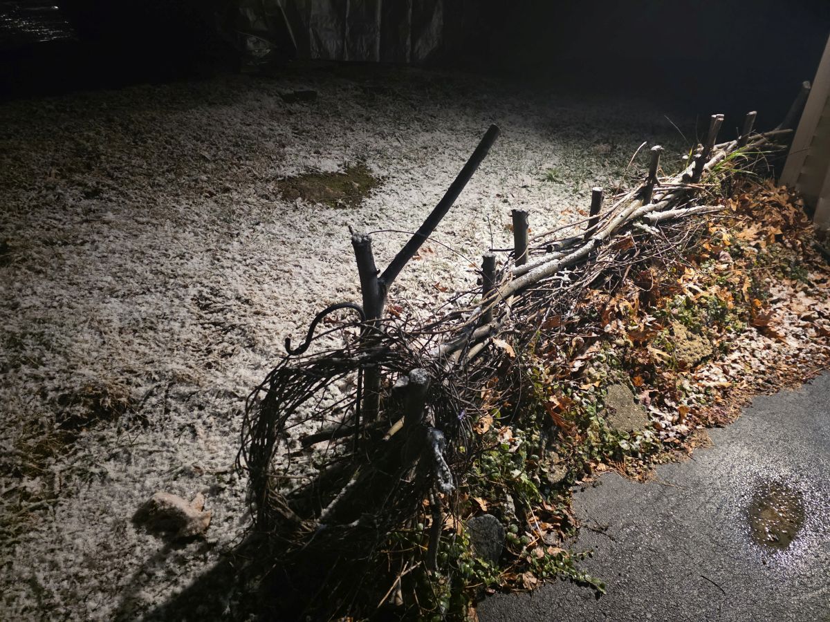 2025 November 23: First snow! Well, technically not the first snow but the first snow that stuck. We’ve had a few of those flitting, crystalline snowfalls midday a couple times but they never lasted and melted as soon as they hit the ground. There was a sudden burst of snow flurries at dusk that lasted maybe a half hour, and it left the barest covers — but we have snow cover. (Probably won’t survive the sun tomorrow morning.)